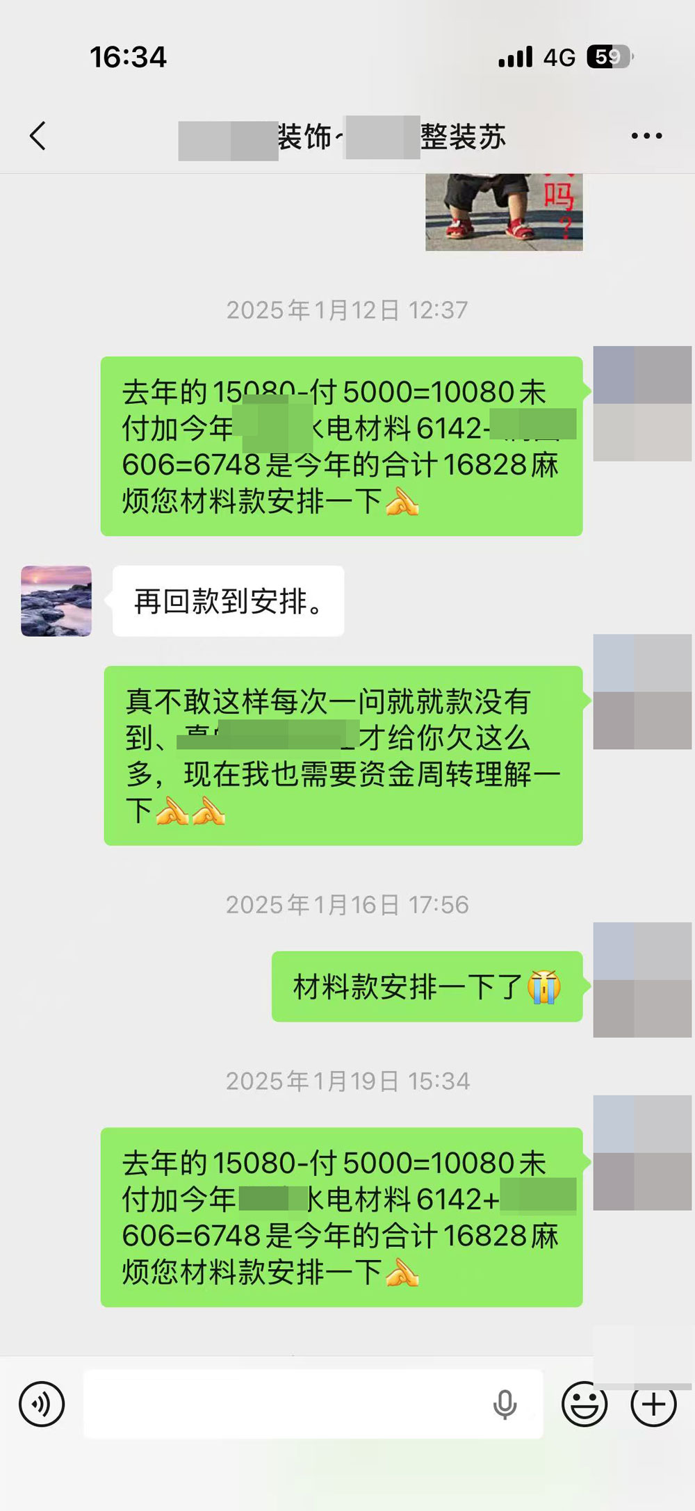截止2025年10月15日,苏*元欠水电材料货款16800元,期间催促多次未还款,至今仍欠付人民币16800元。