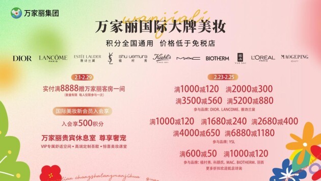 万家丽****美妆,全国积分统一通用,价格低于免税店。2月23日至2月25日,DIOR、LANCOME、雅诗兰黛,满1000减120,满2000减300,满3500减560,满5000减850;YSL满1000减120,满1680减240,满2680减400,满4000减650,满6880减1180。植村秀、科颜氏、MAC、Biotherm、羽西,满600减50,满1000减120,欧莱雅、毛戈平、林清轩、珀莱雅抵店更有超多满额买赠惊喜等着你! 2月1日至2月29日实付满8888元赠万家丽客房一间。即日起,新会员享入会即享500积分,积分**可兑满1000减130美妆券,会员更有尊享VIP专属贵宾休息室,不定期上线美妆课堂,积分兑换好礼,给你满分宠爱,更多美妆福利,欢迎进店解锁。