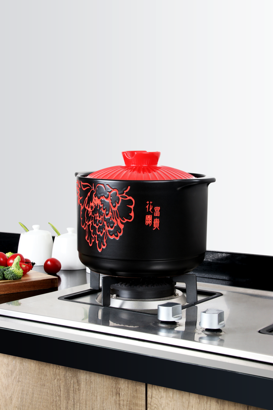 传统的砂锅是陶器的一种,至今已经有几千年的历史。由于制作工艺与原料问题,传统砂锅不耐温差变化,容易炸裂,不能干烧。凯美花开富贵系列砂锅,花田美学,雕刻出的“花开富贵”,寓意吉祥。富贵花开砂锅容量为5.5L,口径为24*17cn,花开富贵砂锅锅身重2.81kg锅盖0.63km**典雅的外观,漆黑色的底色,黑折射出不同的光感,手工雕琢花开富贵图案,为整锅添加了独特的美感,锅盖用了喜庆的红色搭配竖条纹,并贴心设计了可以置放筷子的把手。古人云:病从口入,健康的食材需要匹配不会释放有害成分的锅具,凯美砂锅系列,不含对人体有害的任何元素,煎炸炖煮对食物无任何变化。