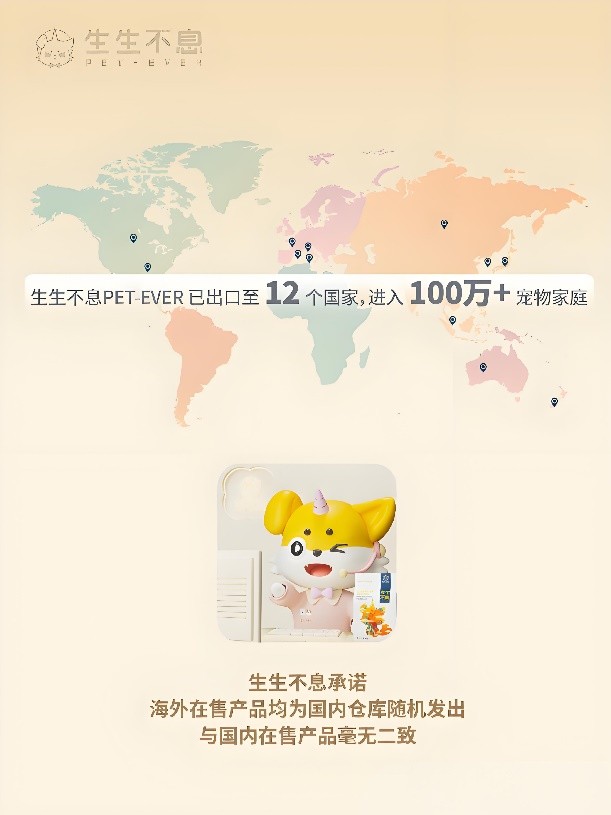 凭借高品质的产品和严格的质量把控,生生不息不仅在国内市场取得了优异的成绩,也成为**个进军美欧澳市场、入驻海外亚马逊平台并荣获FBA认证的国产宠物粮品牌。如今,生生不息已走进12个国家,成为超100万养宠家庭的选择。