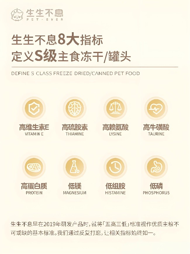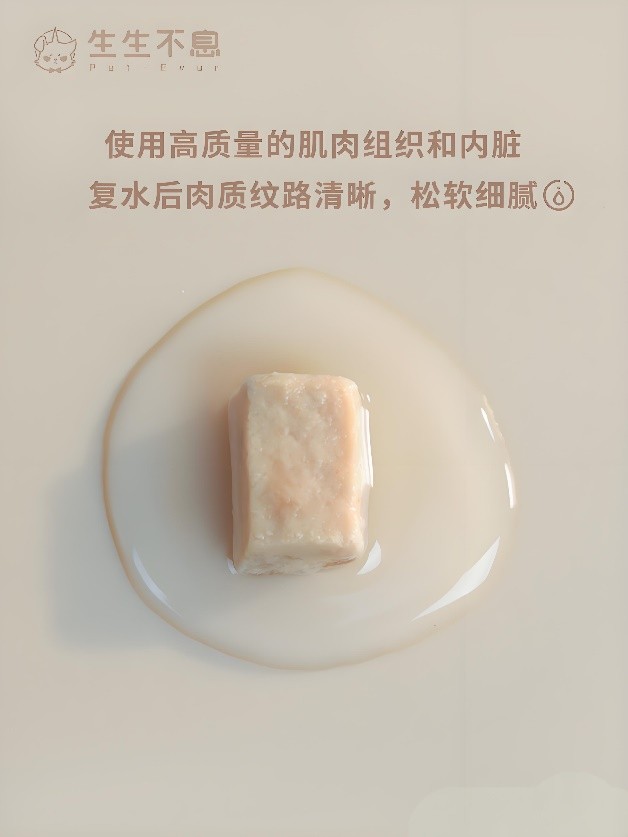 对毛孩子来说,吃得安全舒心,是生生不息和家长们达成一致的共识。当前市场中,主食冻干质量参差不齐,一些工厂达不到生产标准,还有一些选择走捷径,采用高温脱水的方法导致营养水平大打折扣。正规大厂、经过科学检测的主食冻干更值得信任。生生不息与国内头部企业乖宝集团合作,采用FDA推荐的食品级辐照工艺,利用高能粒子射线杀灭有害**,辐照**达医疗无菌级别,真正达到**绿色、环保、安全的质量标准。同时,生生不息坚持48H低温冻干工艺,避免产生致癌的梅拉德反应产物,**程度地保存食材性状。500%的**复水率,为爱宠的泌尿系统保驾护航,有效降低膀胱炎、胰腺炎、尿路结石等疾病的发生风险。